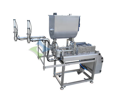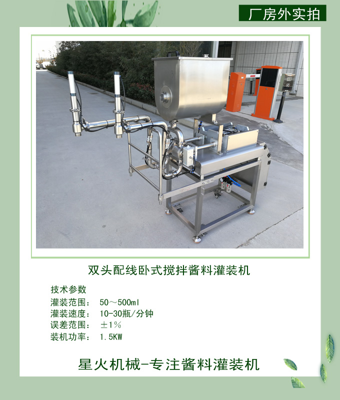 雙頭配線臥式攪拌醬料灌裝機主要是針對粘稠并帶有顆粒且濃度較大的醬狀物料灌裝而設計的,如蘑菇醬、火鍋底料、香菇醬、豆瓣醬、鮮辣醬等灌裝的臥式攪拌醬料灌裝機,臥式攪拌,確保醬和油的充分混合,灌裝物料更均勻,結構簡單、精確度高、操作簡便。